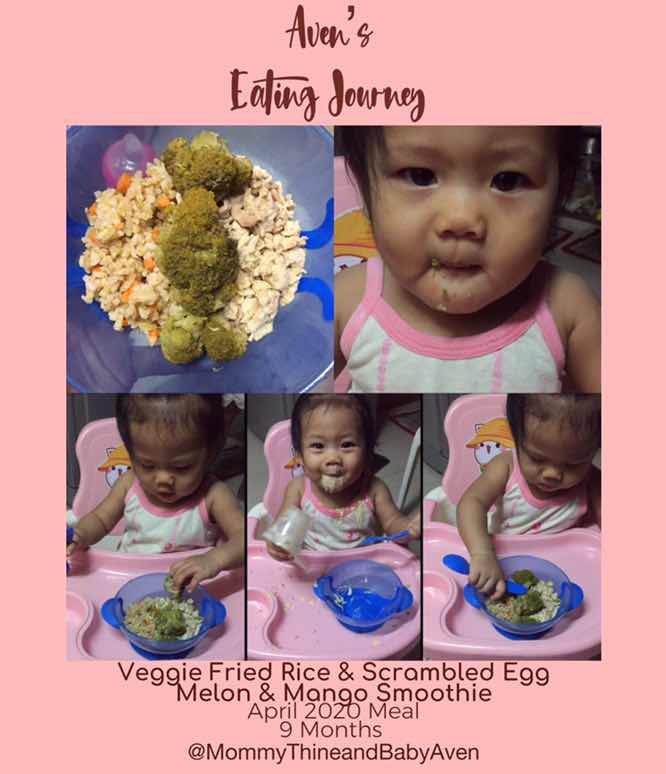 Aven’s Eating Journey 9 Months Meal VEGGIE FRIED RICE ??? Broccoli - steamed and mashed ; and for toppings Carrots - steamed and cut into bits Garlic - finely chopped Unsalted butter - for frying - saute garlic, carrots in unsalted butter - add white rice and mashed broccoli SCRAMBLED EGG ? Egg Moringa Powder Cinnamon -Mix and fry in unsalted butter Melon & Mango Smoothie Ripe Melon Ripe Mango Yogurt -mix and blend Happy Eating ?? Thank you UP Students and to our Barangay ? Galing po sakanila yang mga vegetables ?