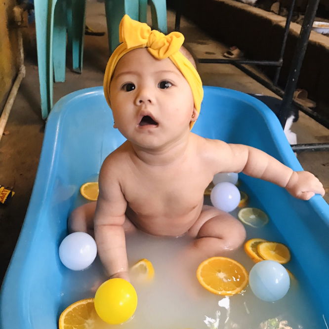 Bebelab’s first ever fruit milk bath ☺️🥰 Did you know? Fruit bath relieves stress, improves blood circulation, nourishes the skin and boosts immunity 💯 the milk on it will help exfoliate the skin for additional softness 👍🏻 Supplies needed? ✅bath tub (i borrowed the bath tub sa kapitbahay hahaha) ✅fruits (I only used lemon and orange) ✅distilled water (Since may wilkins si bebelab na hindi niya nagagamit dahil pure breastfeed naman sya ngayon, yun ginamit ko) ✅boiled water (para hindi sya lamigin kahit nakababad sa water for 20mins) ✅breastmilk or formula milk is okay (i actually used her formula milk Bonna) 😂 ✅bath towel Thats it‼️ Let your baby experience it too ☺️ Oh and btw, make sure your baby can sit unassisted when you do this 😉