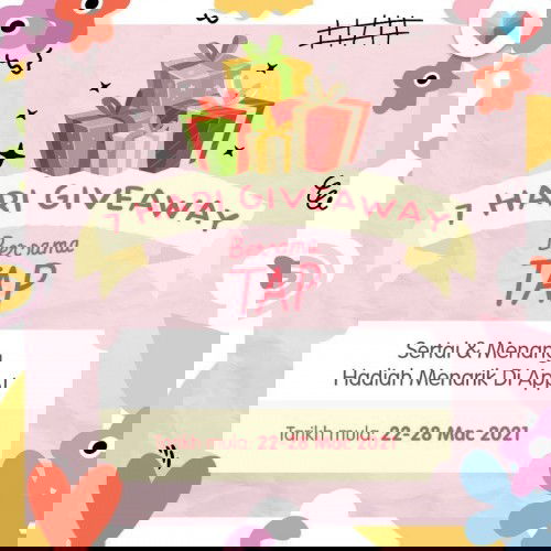 Berita gembira buat pengguna TAP! 7 Hari Giveaway Bersama TAP menanti anda bermula 22 Mac sehingga 28 Mac 2021! Pelbagai barangan menarik untuk anda menangi. Pastikan anda bersedia setiap hari, ya!