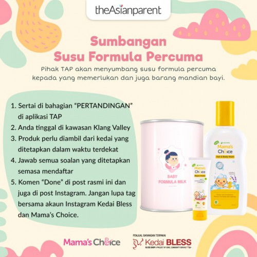 Berita Menarik! 😊 Pihak TAP akan menyumbang susu formula percuma kepada yang memerlukan dan juga barang mandian bayi. Soalan wajib jawab: Susu Formula Jenama Apa Yang Anda Sedang Gunakan? A. Anmum Essential Step 3 B. Nestle Lactogrow 3 C. Dutch Lady 1 2 3 Sila nyatakan jawapan anda apabila mendaftar di bahagian "Pertandingan" nanti. Apa tunggu lagi, jom dapatkan bantuan sekarang: https://community.theasianparent.com/contest/sumbangan-susu-formula-percuma/1555?lng=my