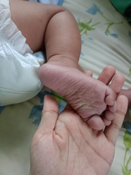 Boy 6mons old Hello mamshie, Simula nung nag aug1 , 3pm nilagnat bigla si bby. Until now nag 38+ pa din sa thermometer. Nag take na sya tempra every 4hrs, at koolfever sa noo. Maliban sa taas baba na init nya, matamlay po sya. Pero hindi po sya nagtatae, hindi nagsusuka, 3oz lang ang ung naiinom nya na dede (FM) na ang usual ay 5oz ubos nya. Wala ubo, at inaassume po na meron syang sipon. PINUPUNASAN kapag umiinit sya. Ask ko lang po kung normal ba sa may lagnat ung nag g gray ang paa? (See photo below) Kapag pinipisil ay naputi Sana ma help nyo ako. TIA momshie
