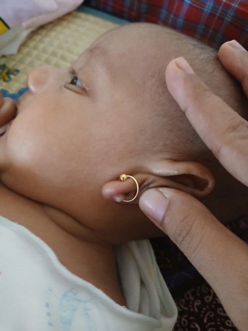 lg bengkak, mungkin tidak cocok dg anting bentuk begitu, bisa jd kebesaran bembuat gesekan trus, coba ganti k yg simple mom, biar g indeksi, olesin betadin ajj stelah d bersihkan, gpp kliatan kotor yg penting g buat dd luka,ato mungkin dd alergi perhiasan
