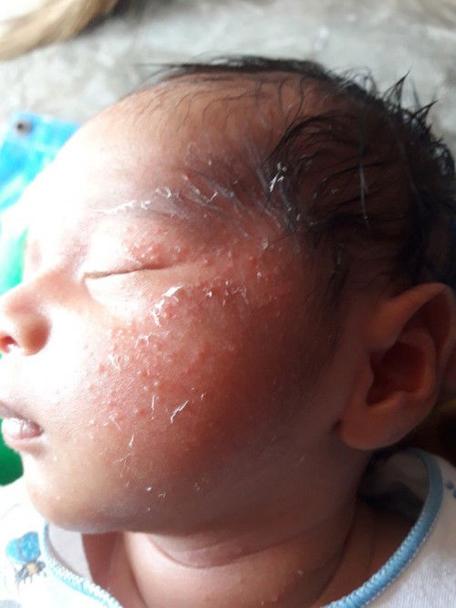 aku udah nanya sm DSA ku. bayiku umur 1 bln saat ini jg kaya gini bun. katanya hanya sering2 dibasuh pake air hangat. akusi udh praktekin, emg ga hilang dgn cepat sih cuma yaa dicoba aja