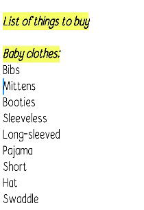 Hello everyone, I am a first time. I'm 28weeks pregnant but to make sure everything is good I made a list of things to buy before giving birth. I AM NO EXPERT. Pero, Subalit, Ngunit etc π you find sth missing, no need to buy, waste of money please have it corrected π Your favorite brand would help too, just please have it stated on our comment box. List of things to buy *Baby clothes* Bibs Mittens Booties Sleeveless Long-sleeved Pajama Short Hat Swaddle *Baby Skin Essentials* Baby Lotion Baby Cologne Baby Powder Baby Shampoo Baby wipes Baby Hair Brush Baby oil Cotton buds Cotton Alcohol *Baby Things* Baby Bottle New Born size diaper Milk Storage Cloth Diaper Baby Blanket Baby Comforter Baby Bag Baby Mosquito Net *Mommy necessities* Adult Diaper Changing Clothes Undergarments Nursing Bra Soap/Shampoo Towel Blanket SSS PhilHealth ID Valid ID's Marriage Contract Ballpen (black)