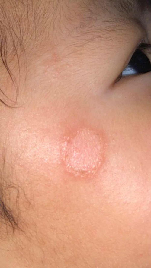 sensitive po ang balat ng baby.. nakukuha yan pag madalas halikan at hawakan ang mukha ni baby ng maduming kamay.. iwasan na lang ang halik halikan. delikado po kasi pag lumala.