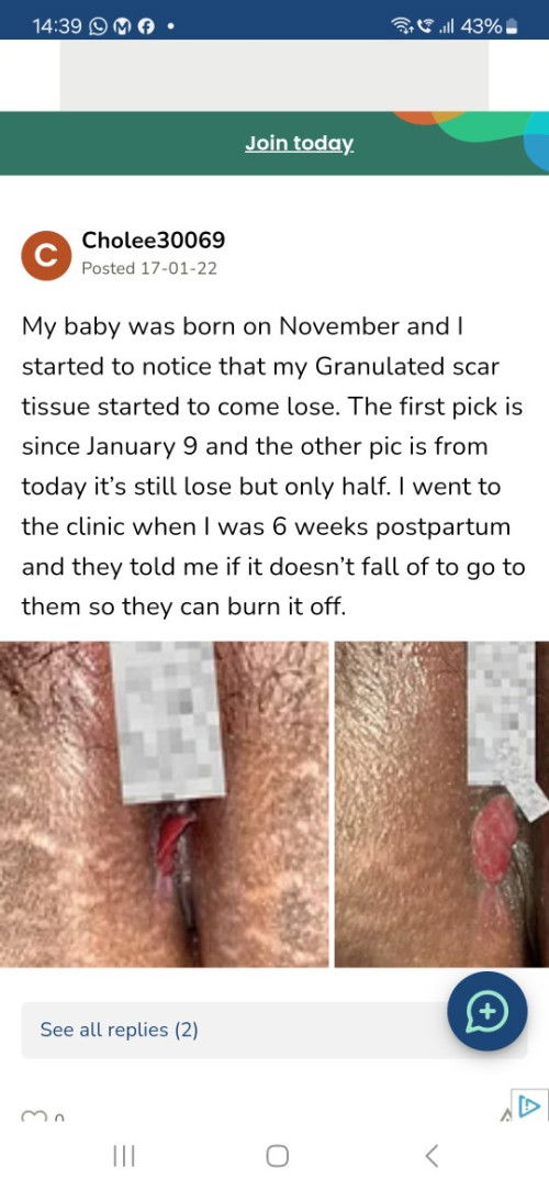 Hye mommies. Siapa pernah alami hypergranulated wound episiotomi? Jahitan benang kulit semua clear rata licin dah. Tp ada lebihan isi kemerahan timbul kat kawasan jahitan tu betul² kat v kita. Lebih kurang macam gambar belah kanan tu. Perit rasa. Tahu ke nak buat apa?
