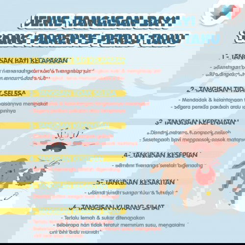 Ibu ayah kena ambil tahu tau jenis-jenis tangisan bayi ☝️ Setiap jenis tangisan ada maknanya ya☺️ Jangan ambil mudah ya dengan tangisan bayi si kecil anda nanti 🙅 *𝐍𝐎𝐓𝐀 : 𝐋𝐈𝐊𝐄 &𝐒𝐈𝐌𝐏𝐀𝐍 𝐏𝐎𝐒𝐓 untuk rujukan masa depan anda.