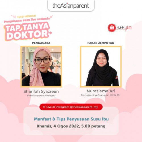 Khas buat ibu menyusu! 🤱🏻 Jom sertai IG Live kami bersama seorang Pakar Laktasi dari Klinik Siti yang akan membincangkan topik Penyusuan Susu Ibu! Adakah anda ingin tahu cara penyusuan dengan betul? Adakah si kecil tidak mahu menyusu badan? Bagaimana ingin tambahkan susu badan? Tanyakan segala persoalan di minda berkaitan topik ini semasa sesi IG Live dan pakar jemputan kami akan menjawabnya. Live akan berlangsung pada 4 Ogos, jam 5.00 petang. Jangan lupa untuk setkan reminder di phone anda! Link: https://www.instagram.com/p/CgnzRjQpL5G/?igshid=YmMyMTA2M2Y%3D #TAPTanyaDoktor #breastfeedingweek #bulanpenyusuansusuibu