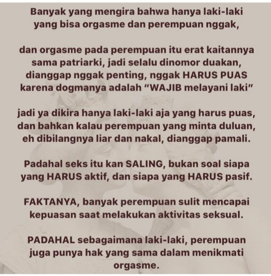 Setujuuu! Belum lagi yg blg sunat pada wanita supaya ga nafsuan, aduh please deh ya nafsu itu sifatnya NATURAL pasti ada pada setiap makhluk hidup buat bertahan hidup dgn memperoleh keturunan! Kenapa sih cewe dilarang nafsuan tapi laki gapapa nafsuan? Sebel deh yg pikirannya kaya gt. Anyway saya punya suami alhamdulillah selalu bikin orgasme, our sex is amazing! Selalu foreplay yg lama, sabar dan tau banget kalo istrinya itu suka sex tp ga pernah ngecap cewek murahan atau ngejudge malahan seneng punya istri yg selalu explore gaya berhubungan dgn berbagai macam gaya dan suasana. Orgasme bukan hanya milik pria!