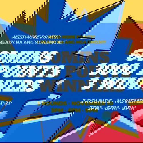 Masyado daw mahaba ang 24 hours for Emoji Games. Agree ba kayo? Kaya naman for tomorrow, November 10, we will be having 3 MINI GAMES na 1-hour each. Sa 3 rounds na ito, may isang magwawagi at makakakuha ng 3000 points each. Tig-2 runners up din na bibigyan ng 1500 points each. Okay ba? G? Abangan ang games tomorrow - 3PM - 6PM - 9PM! Comment here kung may suggestion kayo ng emoji na gagamitin natin tomorrow. Lezzgo!!!!