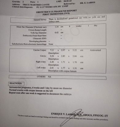 Mga mii Hanggang Ngayon na stress parin Po ako. Plus enlighten me π. Ang LMP ko Po is April 1 to April 6. Nagpa trans v Po ako June 7 , 4weeks and 5days palang ako and gestational sac Palang . Then pinabalik ako ng OB ko, after 2weeks . So Ngayon Po Ang balik ko sa ob ko June 20 . Nung trinans v ako, 6weeks and 1day Nako pero gestational sac palang and embryo, Wala papong baby π . Sabi ni ob possible daw Po na may blighted ovum daw Po ako π . Base sa LMP ko dapat Po 11weeks Nako Ngayon pero sa trans v ko 6weeks palang ako. Ano ba talaga? πππ Parang gusto ko tuloy mag iba Ng OB