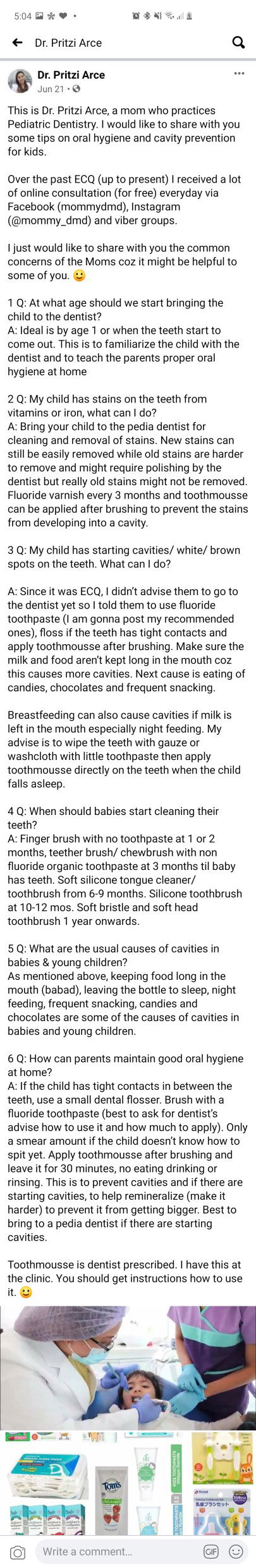 Hi mga momsh share ko lang po ito frim FB by Dr. Pritzi Arce 🥰 This is Dr. Pritzi Arce, a mom who practices Pediatric Dentistry. I would like to share with you some tips on oral hygiene and cavity prevention for kids. Over the past ECQ (up to present) I received a lot of online consultation (for free) everyday via Facebook (mommydmd), Instagram (@mommy_dmd) and viber groups. I just would like to share with you the common concerns of the Moms coz it might be helpful to some of you. 🙂 1 Q: At what age should we start bringing the child to the dentist? A: Ideal is by age 1 or when the teeth start to come out. This is to familiarize the child with the dentist and to teach the parents proper oral hygiene at home 2 Q: My child has stains on the teeth from vitamins or iron, what can I do? A: Bring your child to the pedia dentist for cleaning and removal of stains. New stains can still be easily removed while old stains are harder to remove and might require polishing by the dentist but really old stains might not be removed. Fluoride varnish every 3 months and toothmousse can be applied after brushing to prevent the stains from developing into a cavity. 3 Q: My child has starting cavities/ white/ brown spots on the teeth. What can I do? A: Since it was ECQ, I didn’t advise them to go to the dentist yet so I told them to use fluoride toothpaste (I am gonna post my recommended ones), floss if the teeth has tight contacts and apply toothmousse after brushing. Make sure the milk and food aren’t kept long in the mouth coz this causes more cavities. Next cause is eating of candies, chocolates and frequent snacking. Breastfeeding can also cause cavities if milk is left in the mouth especially night feeding. My advise is to wipe the teeth with gauze or washcloth with little toothpaste then apply toothmousse directly on the teeth when the child falls asleep. 4 Q: When should babies start cleaning their teeth? A: Finger brush with no toothpaste at 1 or 2 months, teether brush/ chewbrush with non fluoride organic toothpaste at 3 months til baby has teeth. Soft silicone tongue cleaner/ toothbrush from 6-9 months. Silicone toothbrush at 10-12 mos. Soft bristle and soft head toothbrush 1 year onwards. 5 Q: What are the usual causes of cavities in babies & young children? As mentioned above, keeping food long in the mouth (babad), leaving the bottle to sleep, night feeding, frequent snacking, candies and chocolates are some of the causes of cavities in babies and young children. 6 Q: How can parents maintain good oral hygiene at home? A: If the child has tight contacts in between the teeth, use a small dental flosser. Brush with a fluoride toothpaste (best to ask for dentist’s advise how to use it and how much to apply). Only a smear amount if the child doesn’t know how to spit yet. Apply toothmousse after brushing and leave it for 30 minutes, no eating drinking or rinsing. This is to prevent cavities and if there are starting cavities, to help remineralize (make it harder) to prevent it from getting bigger. Best to bring to a pedia dentist if there are starting cavities. Toothmousse is dentist prescribed. I have this at the clinic. You should get instructions how to use it. :)