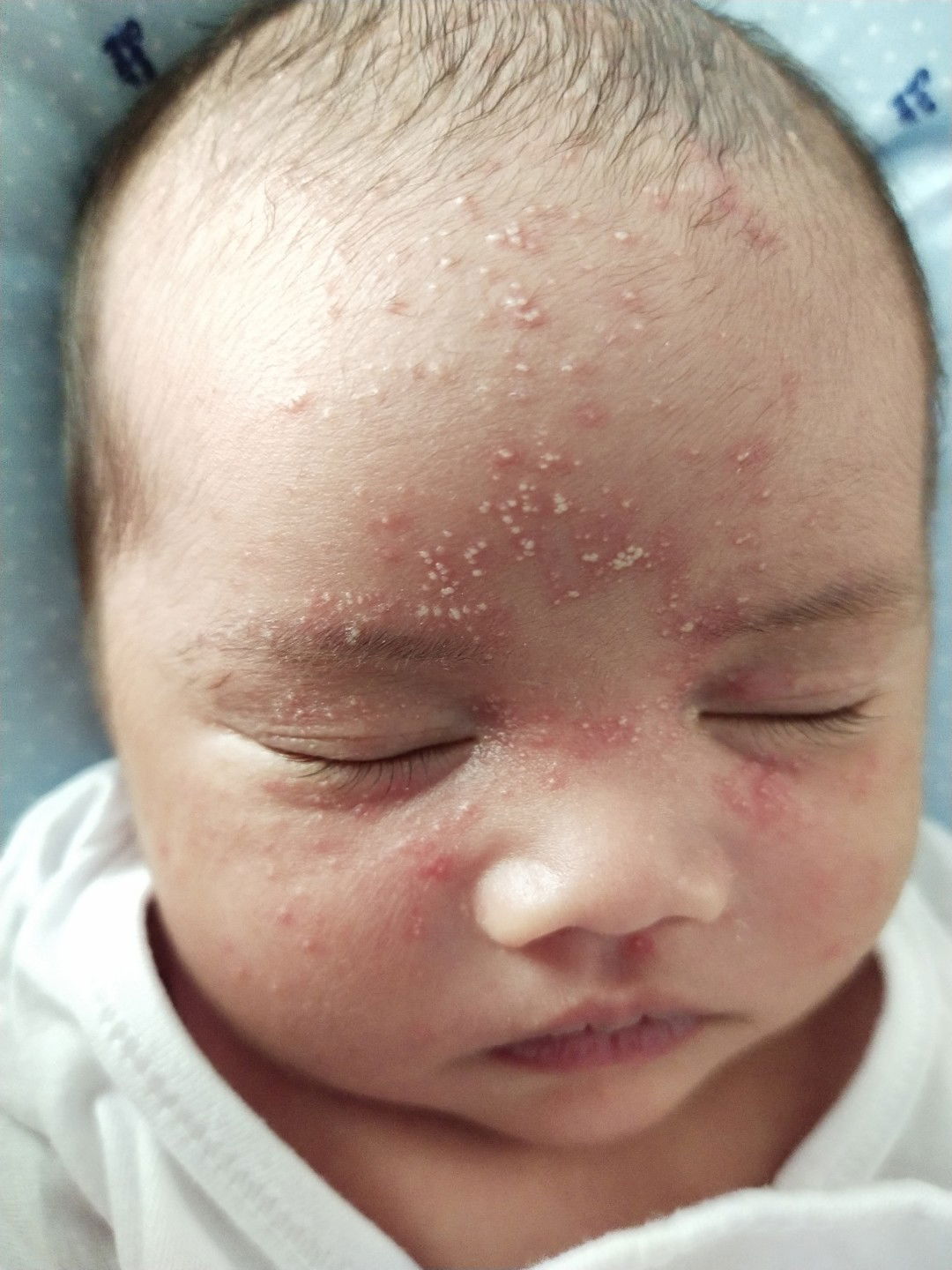 Yes pero bawal hawakan lalo na ikiss sa face si baby kase wala pa syang months. Wag nyo po hahawakan at kiss muna. Lalo pag kay daddy nya at may bigote. Punasan nyo po ng hulak with water para mawala. Iwasan nyo po madumihan yubg face nya. Pati po malagyan ng buhok. Ganyan po baby ko kaso di ganyan ka grabe hehehe