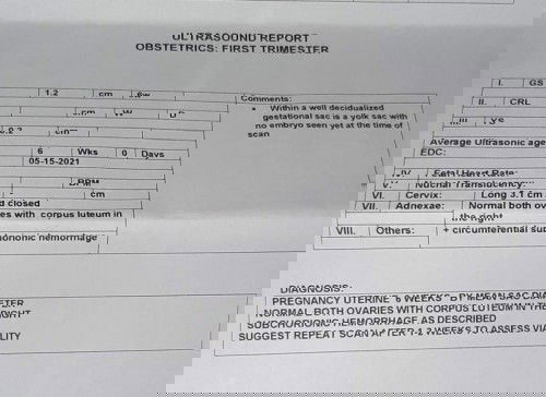 Maaga pa po kasi pra mkita po si baby kaya pinarrepeat po ang scan nio afyer 1-2weeks and meron dw po kayong subchorionic hemorrhage or pagdudurugo sa loob... better po sa pgbalik niyo ask niyo po si ob...