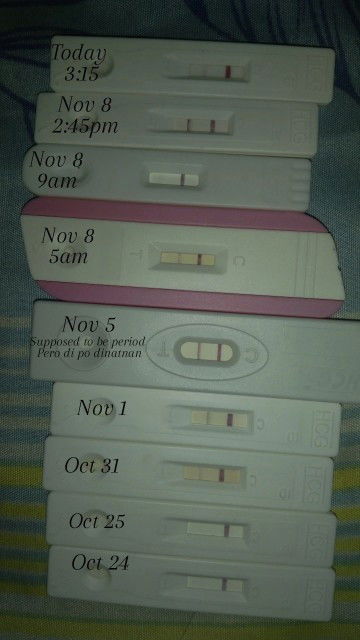 Nalilito po kasi ako if positive ba talaga since faint lines po yung iba. But yung 24 and 25 po was before my period. Yung isang "Nov 8, 9am" lang po ang tanging nag negative but that was after I ate breakfast and nag water. The rest po was faint lines and Nov 5 was clear lines po na positive. And spotting rin po ako for 3 days. Need pa po ba ng blood test before OB check up or magpa check na po ako agad?