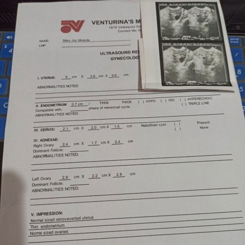 Hello po ito po ulit ako, nagpacheck up na po ako last august 24 nagpa transV ultrasound narin po, ang sabi po ni doc no pregnancy pero observe parin daw after 2-3 weeks 😔 niresetahan lang nya ako ng folic acid for vitamins. Still now delayed parin ako 🥺 wala namang ibang nakita si doc. Baka daw po possible na maaga pa yung pagpapa ultrasound ko kaya di agad nakita. Nagrequest din ako kay doc ng papakuha sana ako dugo para dun makita kaso sabi nya kahit daw magpaganun ako kung nadetect sa ultrasound na walang pregnancy possible daw po na maging negative parin daw dun kaya payo nya sakin mag wait daw po ako ng 2-3 weeks pa 😔😔 nasa litrato po yung results for my ultrasound. Salamat po ulit sa makakahelp sakin 🤗❣️