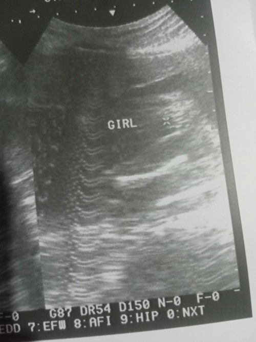 medyo malabk yung ultrasound pero pag tinitigan ng maigi yung may X mark, mukang girl nga po. I think bili ka na lng ng white or nude color Sis.. :) saka na lang yung may girl color pag labas na lang.