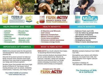 Reason bakit kailangan natin ng Vitamin D, B and Calcium Fern-D Vitamin D -Prevents 32 kinds of cancer, PCOS, dysmenorrhea,heart disease, bukol sa katawan, psoriasis, stroke, respiratory disease, injuries, diabetes, alzheimer's disease, influenza and pneumonia, kidney disease and also helps with high blood, high cholesterol, migraine, vertigo FernActiv B Vitamins B1, B2, B6 and B12 with Iron, calcium and zinc -Anti-stress, boost immunity, increases energy level, mental alertness, for muscle pains and nerve problems and helps produce red blood cells. MilkCa Calcium -Pure cows milk, helps repairs bone fractures, osteoporosis, for kids and adults, pregnant and breastfeeding moms who need calcium for babies Be a member and avail the lifetime discount! Message me for details and inquiries?