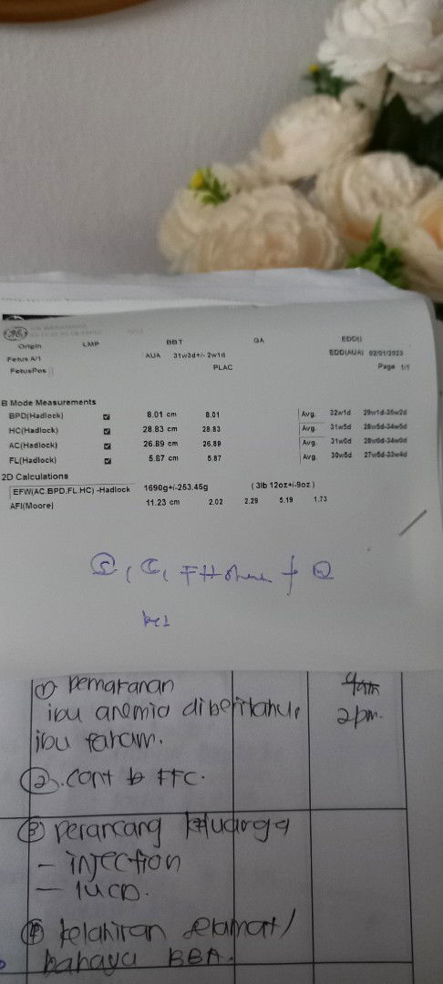 bawah perkataan calculations tu ada EFW(estimated fetal weight)/(anggaran berat janin).. kat situ tulis 1690g bersamaan lebih kurang 1.6kg sis