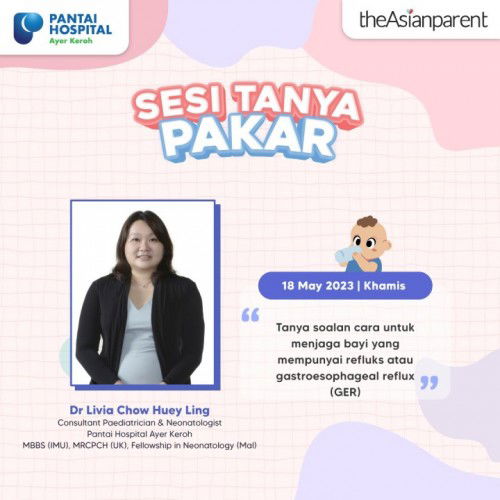 Salam Sejahtera Semua Pengguna TAP! Ibu bapa baru pasti terkejut apabila bayi baru lahir mereka tiba-tiba muak, jeluak atau muntah selepas menyusu, walaupun sudah di sendawakan. Jangan risau, ini perkara yang biasa dilalui cuma janganlah kita mengambil mudah pula kerana muntah yang berlebihan boleh menyebabkan masalah lain juga. Tahukah anda cara menjaga bayi yang kerap muntah bagaimana? Anda pernah dengar tak tentang gastroesophageal reflux (GER)? Kenapa bayi muntah susu? Apakah punya yang menyebabkan ini berlaku? Berapa lamakah ia akan berterusan? Jika anda mempunyai soalan-soalan seperti di atas, anda wajib ikuti sesi tanya pakar ini. Jom tanya soalan anda tentang cara untuk menjaga bayi yang mempunyai refluks atau gastroesophageal reflux (GER) bersama Dr Livia Chow Huey Ling, Consultant Paediatrician dan Neonatologist di Pantai Hospital Ayer Keroh pada 18 Mei 2023, hari Khamis. *NOTA: Sebarang persoalan di luar daripada topik dan tarikh yang ditetapkan mungkin tidak akan dijawab atau dipadam terus.