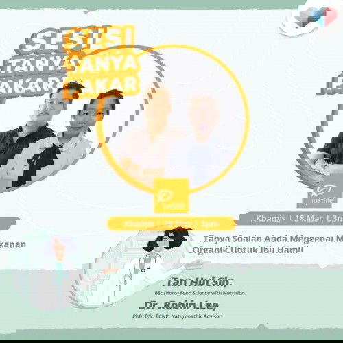 Sesi Tanya Pakar kini kembali lagi dan kali ini kami bawakan khas dua orang pakar kepada anda iaitu Doktor Robin Lee, Penasihat Naturopatik dan Cik Tan Hui Sin dari Justlife untuk membincangkan bersama anda topik mengenai Pemakanan Organik Ibu Hamil. Tanya soalan anda mengenai Makanan Organik Untuk Ibu Hamil dan soalan anda akan dijawab terus oleh pakar kami pada Khamis, 18 Mac jam 3 petang. *Sebarang persoalan diluar daripada topik dan masa yang ditetapkan tidak akan dijawab atau akan dipadam.