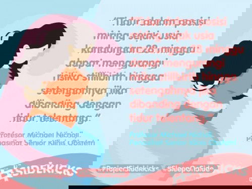 Tahukah Anda, tidur telentang selama trimester ketiga meningkatkan risiko stillbirth (bayi lahir mati) dan bayi berat lahir rendah? Dianjurkan agar Bumil tidur di sisi tubuh (miring) dan perbanyak istirahat, #ProjectSidekicks #TAPSidekicks #SleepOnSide