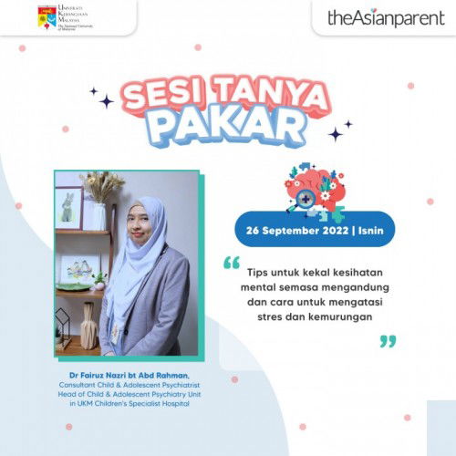 Tanya soalan anda tentang tips untuk kekal kesihatan mental semasa mengandung dan cara untuk mengatasi stres dan kemurungan bersama Dr Fairuz Nazri bt Abd Rahman, MBChB (Glasgow), DrPsych (UKM), AdvMChAdolPsych (UKM) Associate Professor Consultant Child & Adolescent Psychiatrist Head of Child & Adolescent Psychiatry Unit in UKM Children's Specialist Hospital, Psychiatry Department pada 26 September 2022, hari Isnin (harini). Boleh tanya soalan anda di sini: https://community.theasianparent.com/q/ibu-ibu-semuaanda-rasa-tak-semasa-mengandung-ni-emosi-macam-tidak-stabil-y/4198877